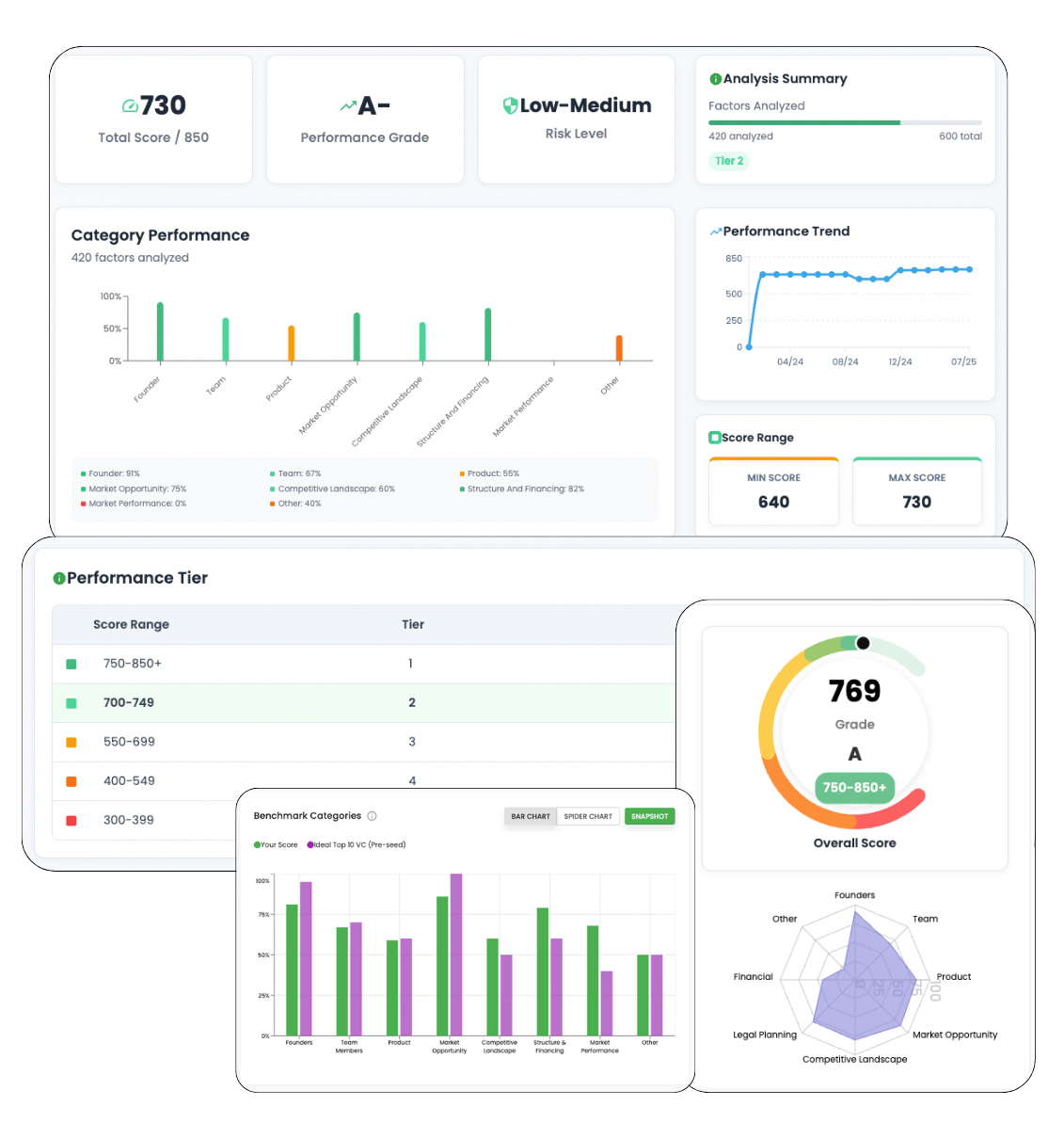 A comprehensive suite of AI-driven reports and analytics designed to evaluate, benchmark, and accelerate startups from idea stage to Series A. Gain actionable insights across market positioning, investor readiness, pitch performance, and strategic growth to improve fundraising and long-term success.
